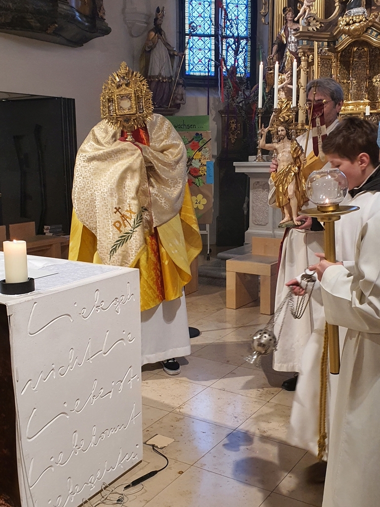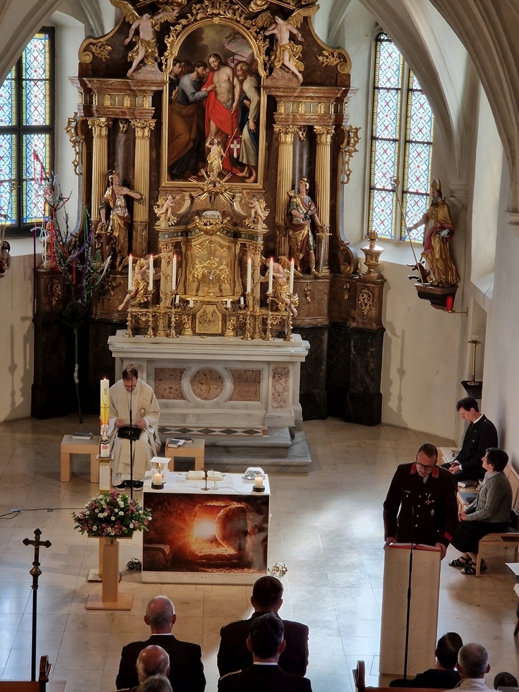 Die Auferstehungsfeier zelebrierten Vikar Gerhard Hatzmann und Diakon Michi Zepf, zusammen mit den Minis, den Lektorinnen und Lektoren, mit Kantor und Kantorin, der Musikgruppe und allen Gläubigen.